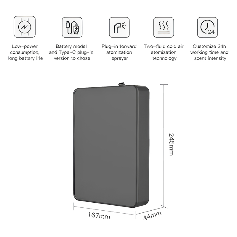 With coverage of up to 300–500 cubic meters, this diffuser is suitable for homes, offices, retail spaces, clinics, salons, hospitality environments, and waiting areas. The slim wall-mounted design keeps the unit discreet while still delivering strong, even scent coverage.